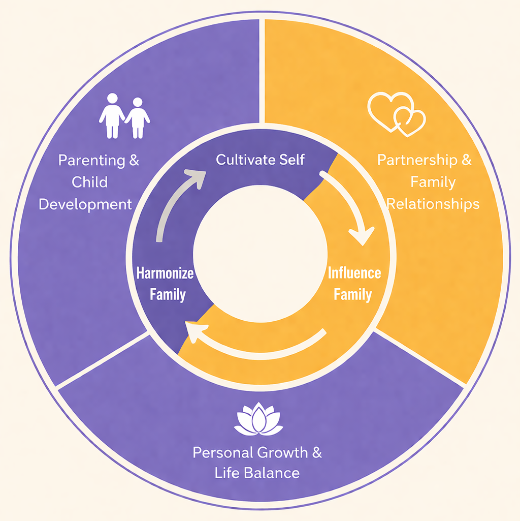 We focus on three core areas: Parenting and Child Development, Partnership and Family Relationships, and Personal Growth and Life Balance.